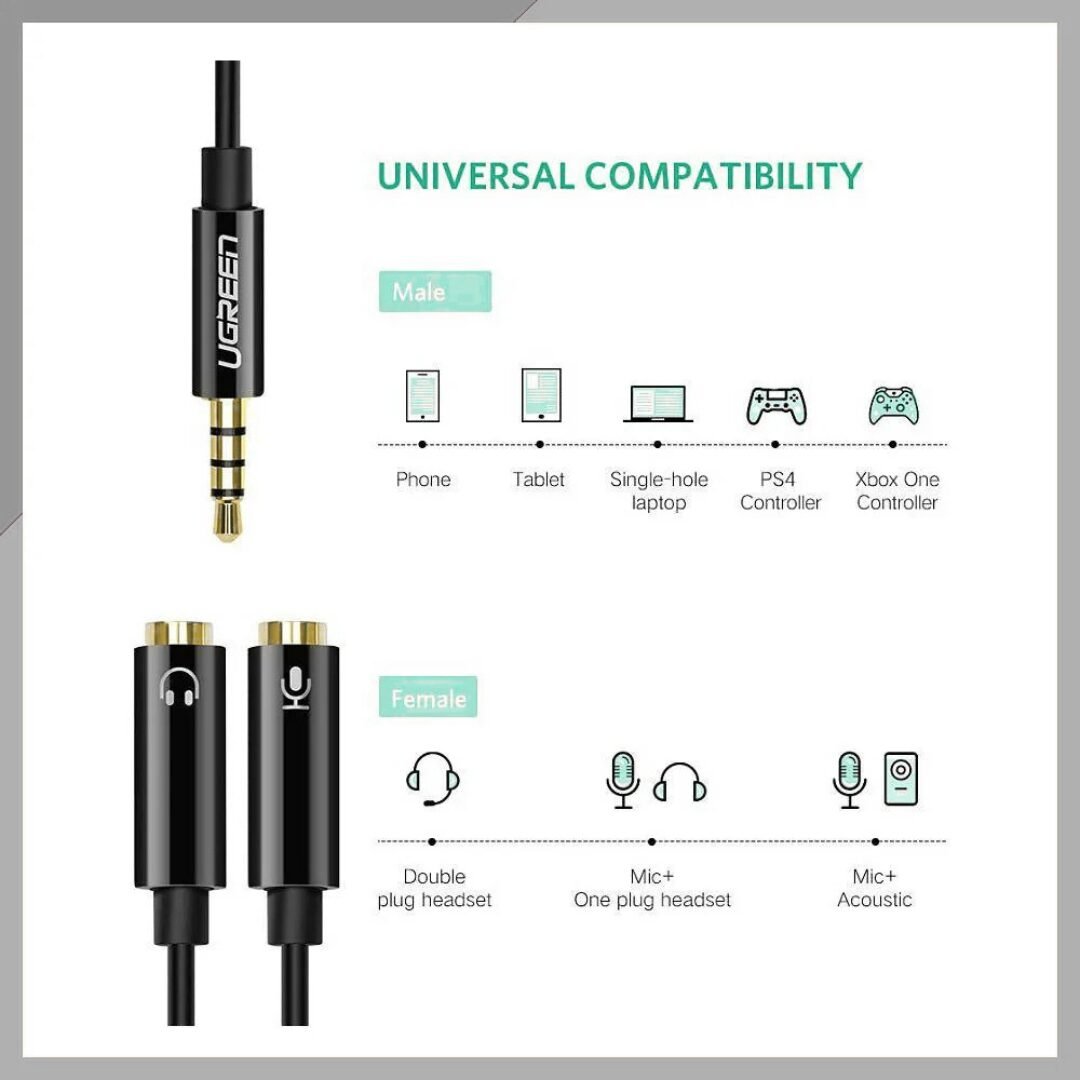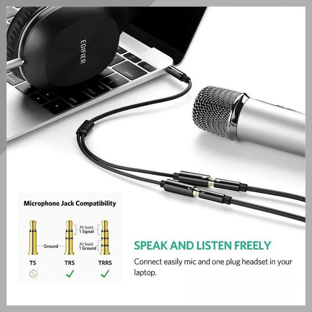 UGREEN AV141 3.5mm Audio Mic Splitter lets you connect headphones and microphone separately to a single audio jack device.