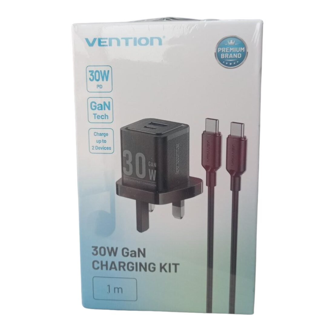 Original Vention 30W PD GaN fast charger with dual charging and 1M cable included.