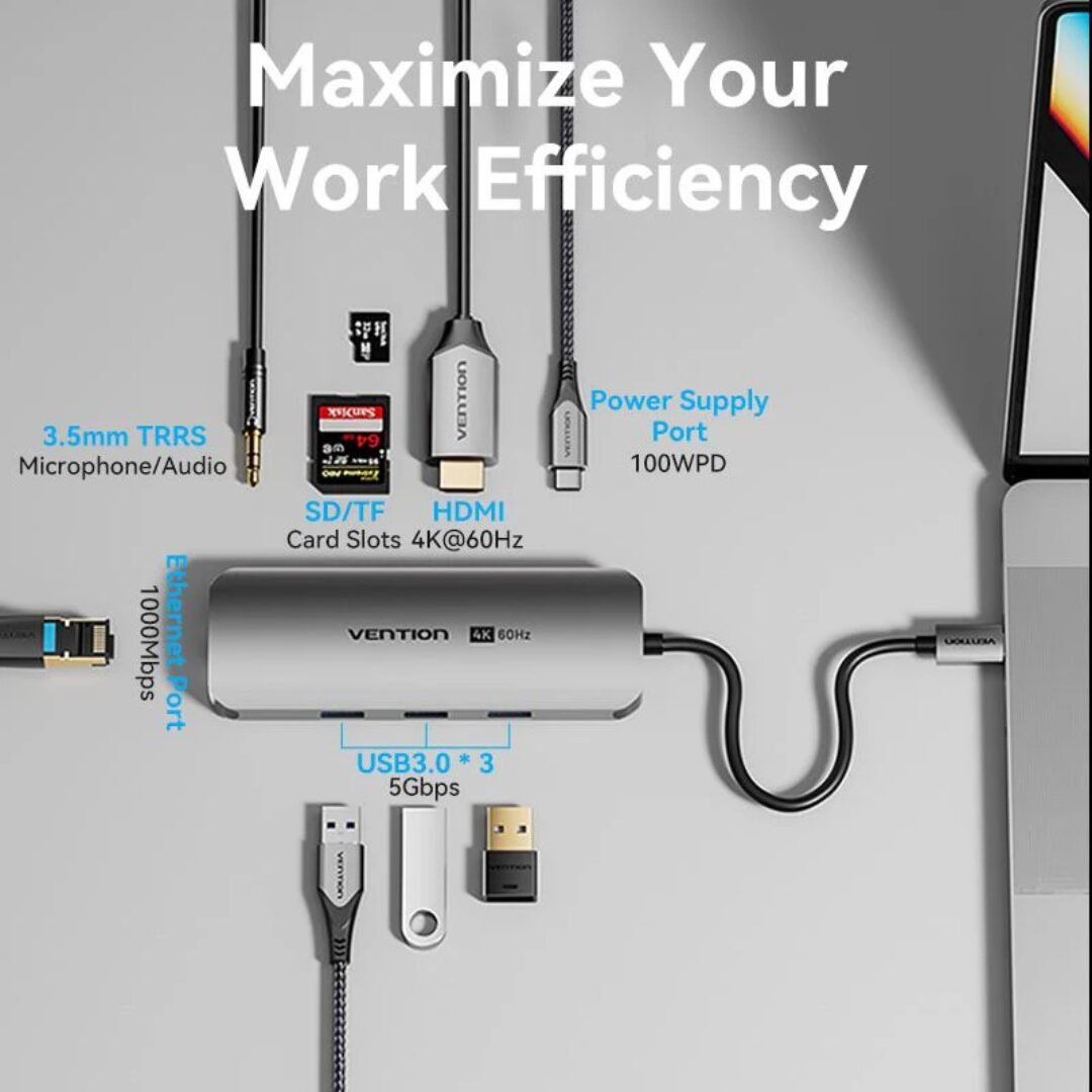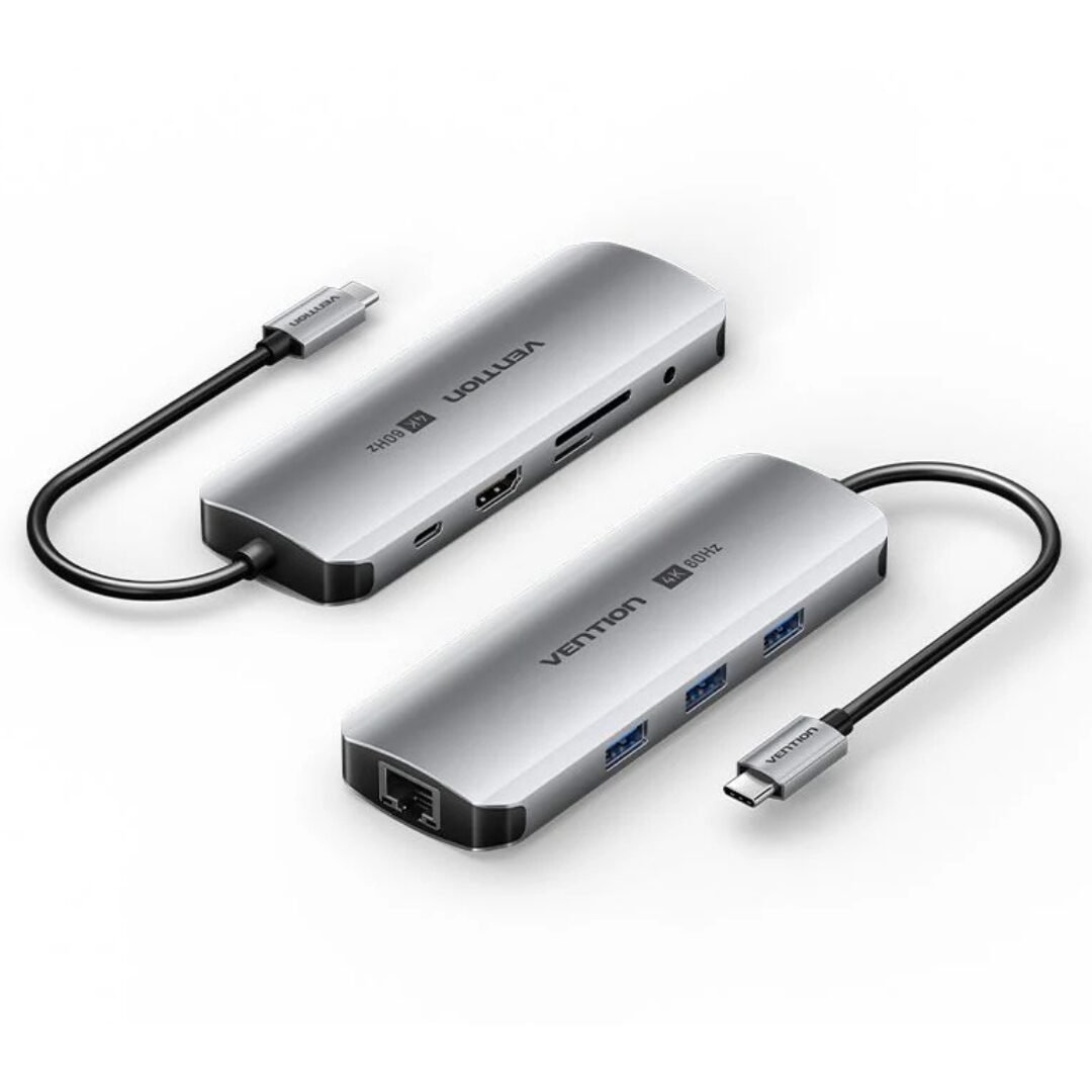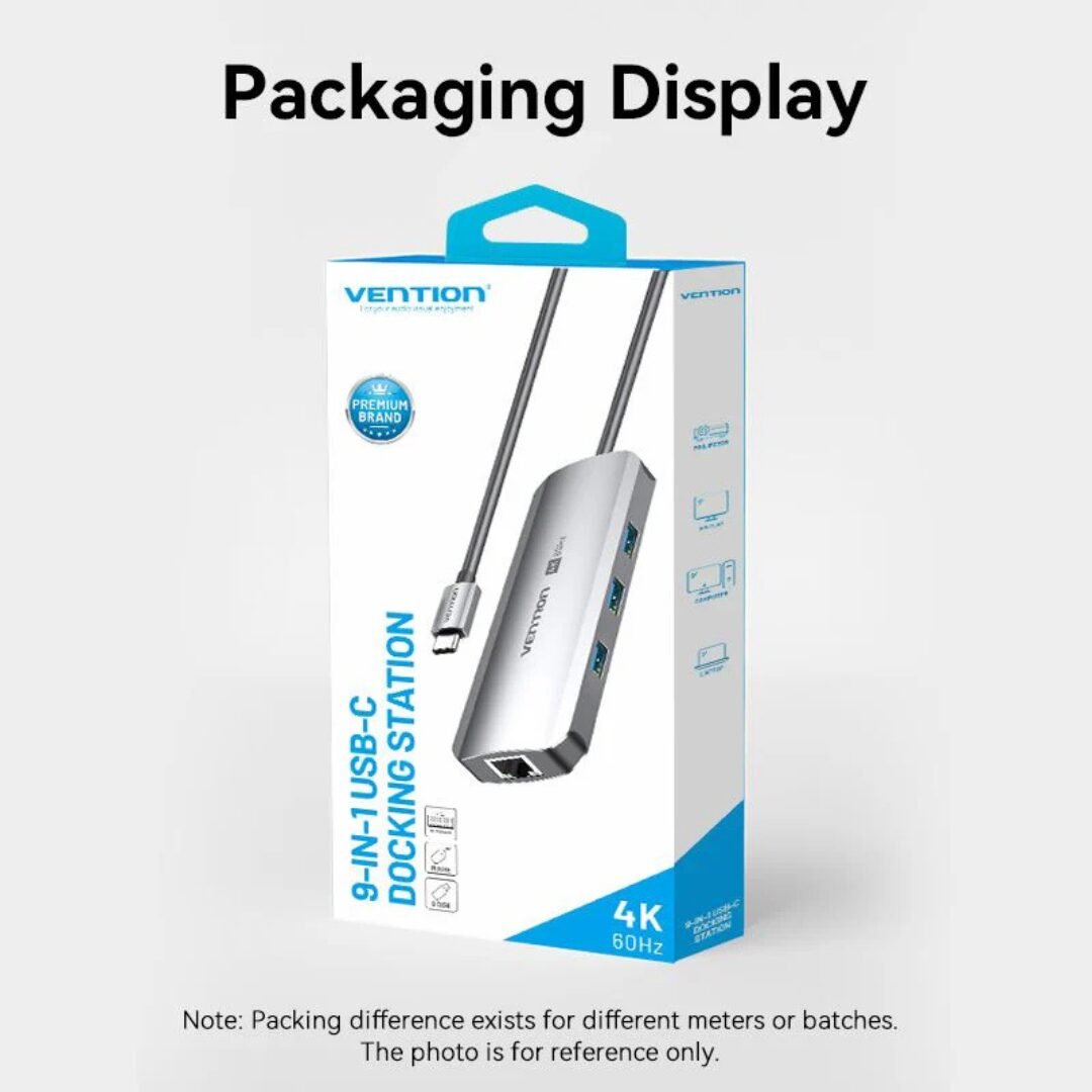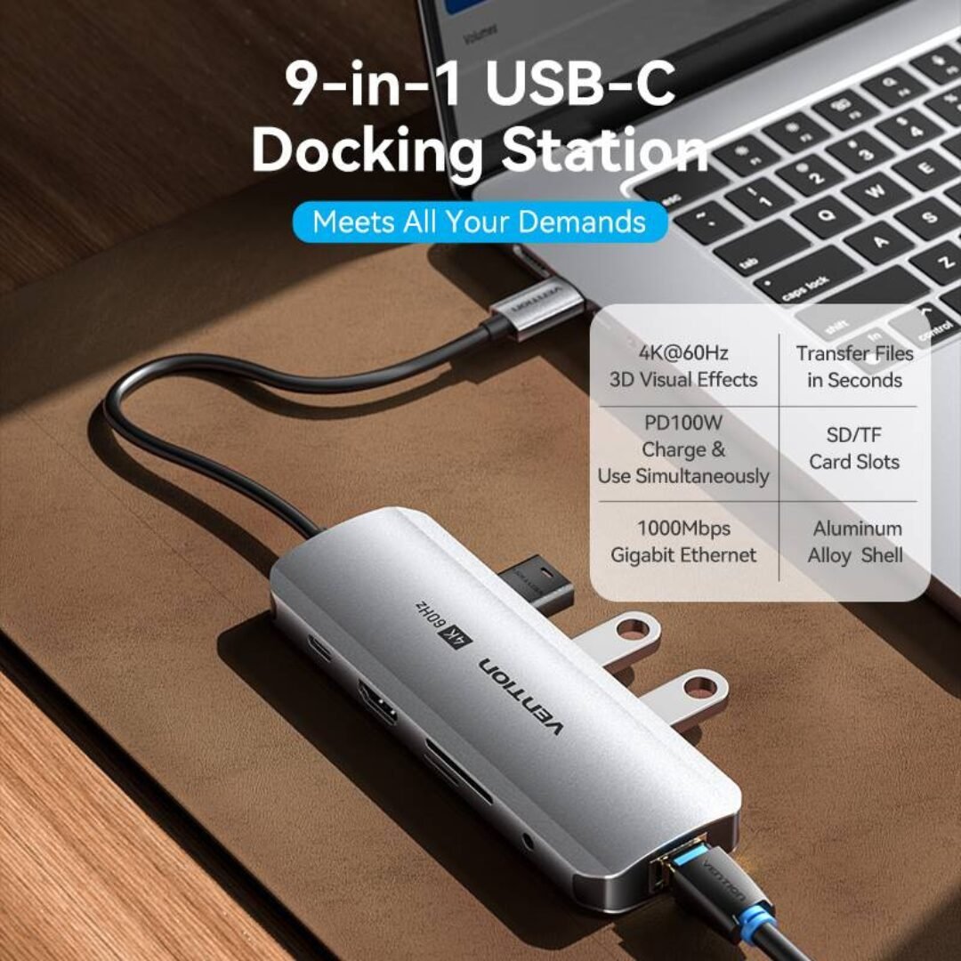 Vention 9-in-1 USB-C Docking Station expands your laptop with HDMI, USB, LAN, audio, and PD charging in one compact hub.